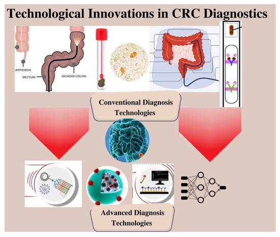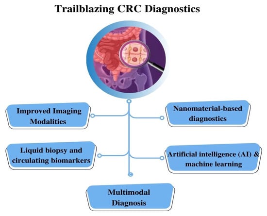 In oncology diagnostics, there has always been a strong emphasis on detecting cancer at an early stage. This principle applies notably to CRC, as the prompt recognition of signs and symptoms associated with CRC during asymptomatic or pre-cancerous stages can profoundly influence treatment modalities (e.g., personalized care) and overall prognosis (e.g., survival rates and enhanced quality of life) []. So far, several standard diagnostic modalities have contributed to the early intervention and improved management of CRC and patient outcomes. These modalities encompass screening tests such as fecal occult blood tests (FOBT), fecal immunochemical tests (FIT), and stool DNA tests, as well as standard diagnoses such as colonoscopy, which directly visualizes a biopsy of abnormal tissue or polyps, or computed tomographic colonography (CTC) as a less invasive alternative [,]. Furthermore, blood-based biomarkers, such as carcinoembryonic antigen (CEA) and circulating tumor DNA (ctDNA), have also demonstrated promise as non-invasive screening modalities for CRC. Nevertheless, these conventional methodologies are often limited in sensitivity and specificity, and there is a lack of sufficient validation of stool DNA tests. Other practical concerns include the risks associated with the invasive colonoscopy as well as the ionizing radiation exposure inherent in CTC [].