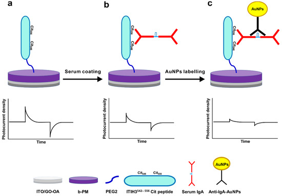 Following a previous procedure [22], an ITO glass electrode was sequentially coated with 0.1 mM of APPA, a GO-OA complex linker that was made by mixing GO and OA at a 1:10 weight ratio, and then 1.5 mg/mL of b-PM, which was then subjected to a laminar shear flow (Reynolds number = 0.9). The preparation yielded a b-PM monolayer-coated electrode, which was termed a b-PM chip. To prepare an RA sensor chip, a b-PM chip was first modified with 5 mM Bis(NHS)PEG2 in phosphate buffer (PB) (10 mM, pH 7.4) at room temperature for 30 min; coated with 40 μM of the ITIH3542–556 Cit peptide in phosphate-buffered saline (PBS) (0.14 M, pH 7.4) at 4 °C for 2 h; and finally, blocked with 0.2 M of glycine in PB. For detection, the RA sensor chip was drop-coated with 5 µL of the 100-fold diluted serum in PBS at 4 °C for 2 h and briefly rinsed with PBS, and the photocurrent was measured. For signal enhancement, the serum-coated RA sensor chip was further drop-coated with 5 µL of 20 pM (particle molarity) anti-IgA-AuNPs in PBS at 4 °C for 2 h. After a brief rinse with PBS, the photocurrent was measured again.