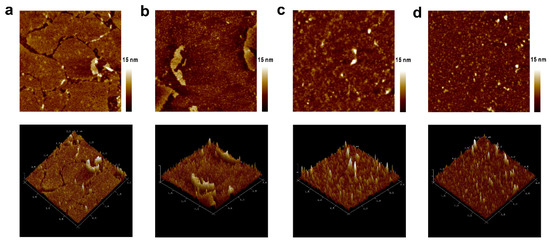 AFM (upper) topographic and (lower) 3D images of different layer-by-layer fabricated mica. The topmost layer in each image is (a) biotinylated purple membrane (b-PM), (b) ITIH3542–556 Cit peptide, (c) healthy control (HC) serum, and (d) anti-IgA-gold nanoparticles (AuNPs). Scan size: 2 µm.