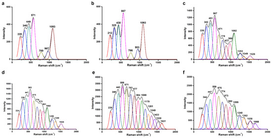 Raman spectra for ITO electrodes that were fabricated using (a) 3-aminopropylphosphonic acid (APPA), (b) graphene oxide (GO)-oxidized avidin (OA) complex linker, (c) biotinylated purple membrane (b-PM), (d) ITIH3542–556 Cit peptide, (e) healthy control (HC) serum, and (f) anti-IgA-gold nanoparticles (AuNPs) at the top. The bands in each spectrum were identified using the PeakFit deconvolution program.