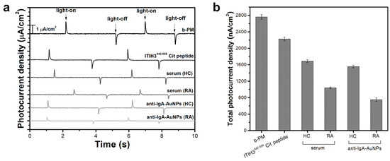 Figure 5b also clearly shows that the subsequent serum coating caused a further reduction in the generated total photocurrent density, as coating with an RA-serum sample led to a significantly greater reduction than the coating with the HC serum (53.3% ± 2.6% vs. 24.1% ± 2.3%). The photocurrent reduction resulting from the serum coating indicated that the ITIH3542–556 Cit peptides conjugated onto the immobilized b-PM surface maintained their binding activity toward ACPAs. The significant difference in the reduced levels between those two different serum samples suggested that the as-prepared RA sensor was sufficiently sensitive to directly distinguish the extents of citrullination between the antibodies in the healthy controls and patient sera with a single-step analysis.