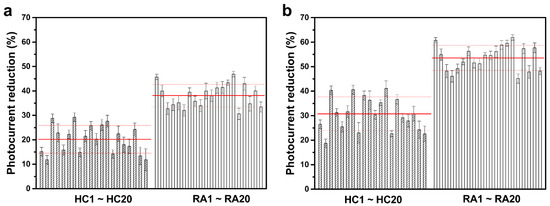 For the clinical test, 40 female serum samples from 20 RA patients (51.10 ± 13.46 years old) and 20 age-matched HCs (50.80 ± 13.01 years old) were collected by medical professionals, and each was analyzed using the developed RA sensor. Table 2 shows clinical and demographic characteristics of individuals who contributed serum samples to this study. Figure 6 shows the analytical results of the sensor study on each individual serum sample. As shown in Figure 6a, in the first direct detection step where the serum samples were directly coated on the RA sensor chips, the average of the photocurrent reduction resulting from the coating with the RA-serum samples was 38.1% ± 4.7%, which was significantly greater than the average value caused by the coating with the HC-serum samples (20.2% ± 5.7%). The analytical results between the HC- and RA-serum samples were more distinct in the second signal enhancement step, where the serum-coated chips were further labeled with anti-IgA-AuNPs. As shown in Figure 6b, after labeling, the HC-serum coated chips yielded an average further photocurrent reduction of 30.6% ± 6.8%, while the RA-serum coated ones had an average reduction of 53.6% ± 5.0%. The higher photocurrent reductions caused by labeling were higher with the RA-serum samples than with the HC-serum samples.