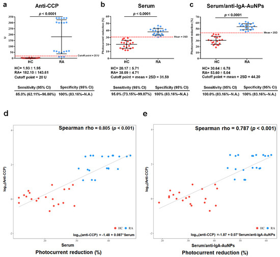 In the anti-CCP ELISA test, the average autoantibody concentration of the RA samples was 182.10 ± 143.61 U, and the average autoantibody concentration of the HC samples was 1.93 ± 1.93 U, as determined via statistical analysis of the data depicted in Figure 7a. According to the vendor’s recommendation, the proposed cutoff point was set to 20 U, resulting in a sensitivity of 85% (62.11–96.80%) and a specificity of 100% (83.6%~NA). NA stands for “not available”. The serum samples were coated onto the RA sensor chips, as seen in the statistical analysis of Figure 7b. The average photocurrent reduction from coating the RA-serum samples was 38.09% ± 4.71%, while the average photocurrent reduction from coating the HC-serum samples was 20.17% ± 5.71%. The suggested cutoff point was established as the mean ± two SDs, (31.59%), leading to an elevated sensitivity of 95.0% (73.15–99.87%) and a specificity of 100% (83.16%–NA). According to the statistical analysis in Figure 7c, the serum samples were coated onto the RA sensor chips and then labeled with anti-IgA-AuNPs (serum/anti-IgA-AuNPs). The average photocurrent reduction from coating the RA-serum samples was found to be 53.60% ± 5.04%, whereas the average photocurrent reduction from coating the HC-serum samples was observed to be 30.64% ± 6.78%. The suggested cutoff point was established at the mean ± 2SDs (44.20%), resulting in a higher sensitivity of 100.0% (83.16%–NA) and a specificity of 100% (83.16%–NA). A nonlinear regression was used to assess the autoantibody measurements. Relationships between anti-CCP ELISA and the RA sensor chips coated with the serum samples or the serum/anti-IgA-AuNPs were estimated using Spearman’s correlations. Statistically significant positive correlations were identified: log10 (anti-CCP) versus the RA sensor chip coated with the serum samples (rho = 0.805, p < 0.001) and log10 (anti-CCP) versus the RA sensor chip coated with the serum/anti-IgA-AuNPs (rho = 0.787, p < 0.001), as shown in Figure 7d,e, respectively. An RA sensor chip had a better diagnostic performance than the anti-CCP ELISA kit, which increased the sensitivity at a fixed 100% specificity. The RA sensor chips coated with the serum/anti-IgA-AuNPs exhibited heightened sensitivity compared to the serum-coated chips. A statistically significant positive correlation existed between the RA sensor chips and anti-CCP ELISA kits in diagnosing RA.