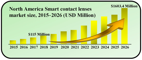 In 2018, the size of the worldwide market for SCLs was valued at USD 115.0 million. Projections indicate that this market is anticipated to achieve a value of USD 1603.4 million by 2026, demonstrating a remarkable compound annual growth rate (CAGR) of 38.9% over the forecast period [32]. SCLs represent a recent leap in wearable electronics, offering the remarkable ability to monitor ocular and tear fluid physiological data. They offer immediate, non-intrusive medical insights into conditions like diabetes and glaucoma. Looking ahead, the potential of SCL technology includes photography through ocular capture and adaptive responses to ambient light changes. These lenses are poised to aid individuals with age-related macular degeneration (AMD) and address a multitude of other applications [33]. The escalating prevalence of diabetes and glaucoma plays a pivotal role in propelling the growth of the SCLs market during the forecast period. Furthermore, increased investment in research for advanced wearable electronics is anticipated to steer the market’s trajectory in the years to come, as shown in Figure 1.