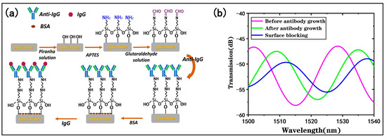 - Growing antibodies. The proposed sensor was immersed in antihuman IgG solution at a concentration of 50 μg/mL 90 min for growing antibodies, and then unbound antibodies were washed with PBS buffer [28].