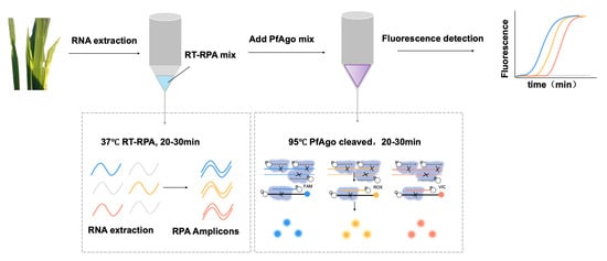 Previous reports have demonstrated the pAgo potential for rapid and on-site detection of multiple human viruses; their applications in detecting plant RNA viruses have not been reported. Therefore, this study aimed to develop a highly specific and sensitive method by combining PfAgo and isothermal RPA amplification to concurrently detect multiple viruses, including RRSV, RGSV, and RBSDV, which is envisaged to outperform RT-PCR regarding specificity, sensitivity, and reproducibility. This innovative technique holds promise for its potential applicability across various plant viruses, enabling expedited identification of viral nucleic acid sequences.