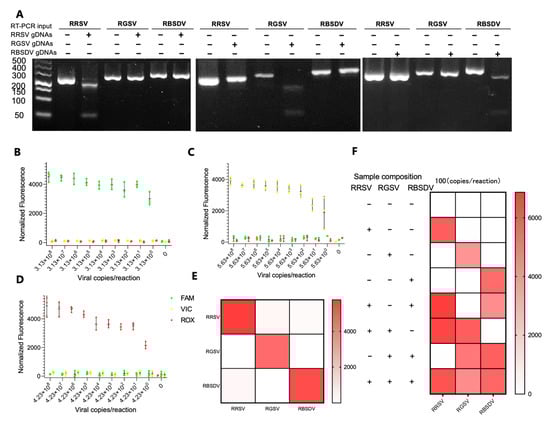 Rice virus management poses a significant challenge due to the unavailability of specific antivirals, which demand early field detection. Currently, predominant approaches for detecting rice viruses encompass electron microscopy [4], serological assays [5], and molecular biology techniques like reverse transcription polymerase chain reaction (RT-PCR) [6] and real-time qPCR [7]. Serological methods, while widely used, often suffer from lower sensitivity, leading to frequent false negatives. Both electron microscopy and advanced molecular techniques necessitate the use of specialized, costly equipment such as electron microscopes and thermal cyclers, along with skilled laboratory personnel, constraining their widespread application. The advent of nucleic acid-based diagnostics has introduced innovative methods like recombinase polymerase amplification (RPA) and loop-mediated isothermal amplification (LAMP) assays. These assays, typically conducted with specifically designed primers recognizing unique sequences of the target, operate under isothermal conditions, obviating the need for thermal cycling. LAMP, in particular, has proven effective in identifying various rice viruses, including RRSV, RBSDV, and RGSV [8,9,10]. Although both RPA and LAMP are apt for field assays, their heightened sensitivity makes them prone to contamination, and they face difficulties in executing single-tube multiplex detection in field settings.