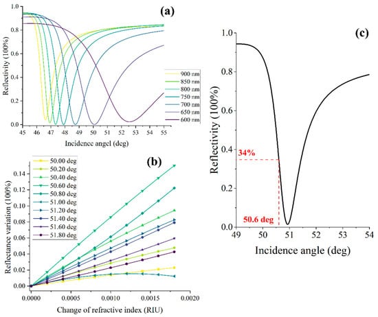 Theoretical calculation and optimization of incident angle and wavelength. (a) The observed SPR angle spectrum curves with different incidence wavelengths; (b) the reflectivity varies with samples at different incident angles at 850 nm incident wavelength; (c) the obtained SPR angular spectrum curve under 850 nm incident wavelength with the sample refractive index of 1.333 RIU.