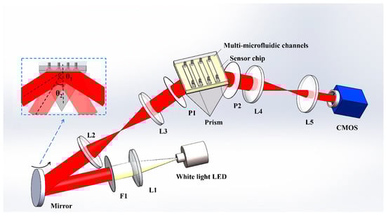 The ISPRi biosensor is shown in Figure 2. The system utilizes an LED (GCI-060401, Daheng Optics, Beijing, China) as the excitation light source. The white light passes through various components before reaching the sensing module. First, it passes through the collimating lens L1 (with a focal length of 150 mm), followed by filter F1 (with a center wavelength of 850 nm and a FWHM of 10 nm). This configuration ensures that only parallel narrowband light is incident on the rotating mirror, which allows the selection of the incident angle. Lens groups L2 (with a focal length of 60 mm) and L3 (with a focal length of 60 mm) form a 4f system. The reflector is positioned on the front focal plane, while the sensing surface is located on the rear focal plane. The sensing module comprises a prism, a sensing chip, and a flow cell. Then, the incidence light passes the polarizer P1 (p-polarized), and it is coupled through the prism to excite the surface plasmon resonance (SPR) phenomenon at the interface between the sensing chip and the detection sample. The reflected light then passes through imaging lens groups L4 (with a focal length of 200 mm), L5 (with a focal length of 75 mm), and polarizer P2 (p-polarized). Finally, it is received by the area array detector CMOS (DMK 33GP031, Imaging Source, Bremen, Germany).