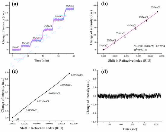 The SPR signal shift was also visually demonstrated by the changes in the refractive index in samples (Figure 3b). It is noteworthy that these observations revealed a robust linear relationship between the SPR signal intensity and the refractive index. The dynamic range of the established detection system was determined as 0.00000–0.00925 RIU, following the previously reported calculation method [19,20]. Additionally, the results also show that the system has good consistency for multi-points sensing. Low concentrations of saline were tested for corresponding RIR (Figure 3c). Increasing saline concentrations were tested from 0% to 0.05% with 0.01% for each increment. These examinations enable us to precisely determine the system’s resolution and its ability to accurately detect even minute changes in the refractive index. Furthermore, to assess the system’s noise characteristics, we conducted tests for continuous and real-time detection of reflected light signal intensity in pure water for a duration of 10 min. As shown in Figure 3d, the obtained results provide valuable insights into the system’s stability and reliability.