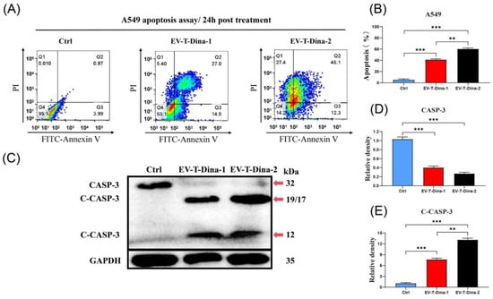 Treatment with EV-T-Dina stimulated significant apoptosis in A549 cells. (A) Representative flow cytometry analysis plots for assessing apoptosis in A549 cells after FITC-Annexin V/PI staining. Cells were treated with PBS (Ctrl), 1.0 ng mL−1 EV-T TRAIL + 10.0 nM Dina (EV-T-Dina-1), and 2.0 ng mL−1 EV-T TRAIL + 20.0 nM Dina (EV-T-Dina-2) for 24 h before the evaluation, respectively. (B) Comparison of apoptosis rates among control and treatment groups. (C) Detection of both caspase-3 (CASP-3, 32 kDa) and cleaved/activated caspase-3 (C-CASP-3, 19/17- and 12- kDa) expression in A549 cells via Western blotting. (D,E) Relative quantification of both CASP-3 (D) and C-CASP-3 ((E), 19/17 kDa) expression levels among control and EV-T-Dina treatment groups. All data are means ± SD (n = 3). ** p < 0.01, *** p < 0.001, by one-way ANOVA/Bonferroni multiple comparison post hoc test.