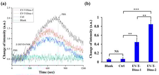 The chemo drug Dina was previously found to synergize with TRAIL-expressing EVs (EV-Ts) to efficiently induce apoptosis in A549 cells [22,30]. In this study, we first treated A549 cells for apoptosis induction by combining the previously prepared EV-T with Dina (EV-T-Dina). Then, we harvested both control and drug-treated cells to extract total cellular proteins for detection of C-CASP-3 with its specific inhibitor Z-DEVD-FMK by using the constructed ISPRi system.