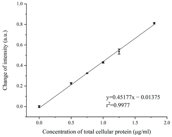 To further examine the relationship between SPR signal intensity and target protein content, serial dilution assay of the EV-T-Dina-2 treatment cellular proteins was performed. Five concentrations of total cellular proteins were analyzed for SPR signal shift by using the C-CASP-3 inhibitor, including 0.00-, 0.50-, 0.75-, 1.0-, 1.25-and 1.75-μg/mL. As shown in Figure 6, a linear correlation was obtained using the least-squares fitting method, revealing the positive linear correlation between SPR signal intensity and expression level of C-CASP-3 in total cellular proteins. The linear correlation coefficient (r2) was calculated as 0.9977, showing that the signal intensity is proportional to the total cellular protein concentration, and thus with the expression levels of C-CASP-3. Therefore, these data show that our ISPRi biosensor can next be adapted for quantitative detection of C-CASP-3 expression in apoptotic cells.