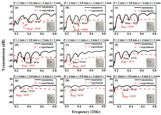In the process of simulation, the wall thickness is selected to be 0.6 mm, 0.8 mm, and 1.0 mm. As the wall thickness increases, the losses of resonant peak 1 increase, as shown in Figure 2a,b,e. For a tube thickness of 0.8 mm, the maximum loss at the order 2 resonance occurs at approximately 0.28 THz; then, the resonant frequency is shifted to a shorter frequency with increasing tube thickness. As the wall thickness of the elements increases, we note a distinct narrowing of the antiresonance window. Therefore, it can be concluded that the simulation and experimental results agree with the theoretical results.