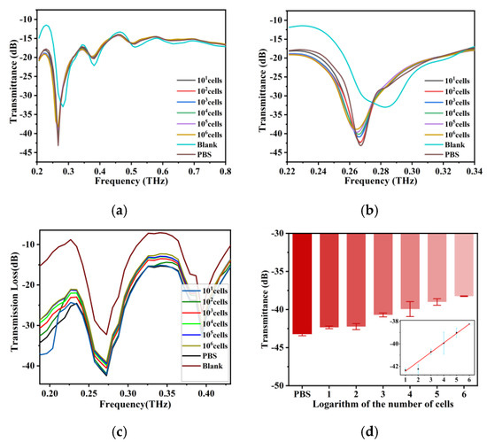 We measured unsampled optical fibers and samples containing 0–106 BT-474 cells. After PBS was added, the formant of the fiber produced a frequency shift to the left. In Figure 3a, we can see the same THz transmission spectrum as the previous simulation results, along with multiple resonance peaks; so, we chose the resonance peak at approximately 0.26 THz as the characteristic peak. As shown in Figure 3b, after adding the samples, there was a characteristic peak at 0.26 THz, and the transmission gradually increased with increasing cell number, which was consistent with the simulation results (Figure 3c). Figure 3d shows a good linear relationship between the logarithm of cell number and THz wave transmittance in the range of cell numbers from 10 to 106. The linear fitting equation is T (Transmittance) = 0.8365Log(C) − 43.26, and the correlation coefficient is 0.9945. This indicates that the biosensor can quickly detect tumor cells without labels and that it has good sensitivity. The change in transmittance that follows the change in cell number is because as the cell number increases, the number of cells in the sample increases, resulting in a decrease in the water content in the same volume of the sample. Because water is highly absorbent to THz waves, the transmittance increases as the water content decreases.