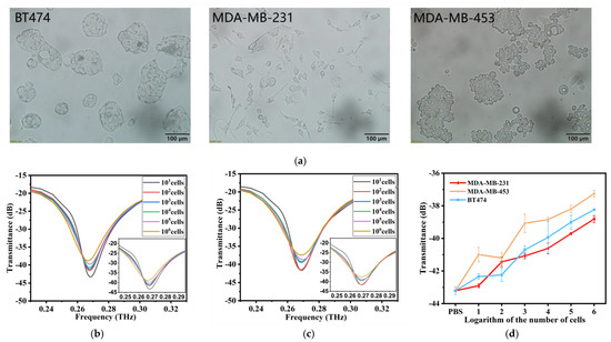 As shown in Figure 4a, different breast cancer cells have different growth patterns and cell sizes, although they are all adherent and epithelioid cells. BT-474 cells are aggregated and grow in patches. MDA-MB-231 is dendritic. MDA-MB-453, which grows rapidly, has rounded cells that grow in clumps like grapes. The transmission spectra of MDA-MB-453 and MDA-MB-231 were obtained by adding them into the THz AR-HCF. We found that, similar to BT-474, with increasing cell number, the transmittance of the characteristic peak at 0.26 THz gradually increased, and there was a linear relationship, as shown in Figure 4b,c. Then, we compared the line plots of the transmission and the logarithm of cell number of the three kinds of cells at 0.26 THz and found that the transmissivity of different breast cancer cells at the same cell number was different, and the higher the cell number, the more obvious the difference was (Figure 4d). Therefore, the biosensors are capable of distinguishing different types of tumor cells through transmission spectra. The difference is mainly due to cell size and metabolism.