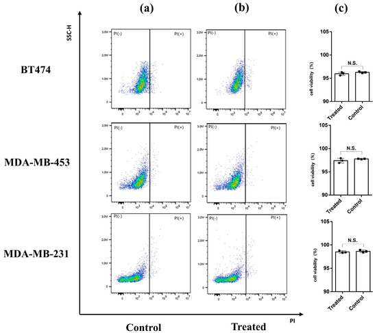After measurements were taken, all cell samples were collected and stained by PI. PI is a common red fluorescent nuclear and chromosome staining agent. Propyl iodide is also commonly used to detect dead cells in a population because it cannot penetrate living cells. When the sample was passed through the flow cytometer, the living cells did not produce a fluorescence signal, while the dead cells emitted red fluorescence under excitation by a 493 nm laser, which was used to distinguish the dead cells from the living cells. Figure 5a shows the negative controls (i.e., the results of the cell samples not exposed to THz waves). The cell viabilities of BT-474, MDA-MB-453, and MDA-MB-231 were 96.27 ± 0.16%, 97.76 ± 0.05%, and 98.63 ± 0.25%, respectively. Figure 5b shows the results of the BT-474, MDA-MB-453, and MDA-MB-231 cells that were irradiated by THz waves. The cell viabilities were 95.96 ± 0.35%, 97.40 ± 0.50%, and 98.5 ± 0.26%, respectively. Then, we analyzed the data via a one-way analysis of variance (Figure 5c). There was no statistical significance in the cell viabilities of the treated group and the control group of the three kinds of cells, indicating that the THz waves did not affect cell activity during the measurement. The sensor can enable the nondestructive detection of tumor cells. We speculated that the differences between the three cell groups might be caused by cell heterogeneity or the order of measurement because PI is slightly cytotoxic and can damage cell activity over time.