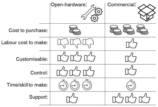 FOSH and FOSS technologies have some advantages compared to traditional “closed” or proprietary product designs: (a) in addition to being free of charge, the designs are developed by users who have strived to ensure the instrument is appropriate to a particular scientific task or application; (b) building your own experimental equipment provides a more comprehensive understanding of the principles behind the design, and better recognise any analytical limitations of such equipment; (c) manufacturing is immediate and local, empowering laboratories worldwide and potentially avoiding dependence on commercial instrument suppliers; and (d) open-source hardware and manufacturing has become a global phenomenon that allows the hiring of gifted hardware designers and software programmers to assist in creating cutting-edge products [,]. The community around open-source hardware can be found building detailed written and video tutorials online, allowing non-experts to recreate and remix designs.