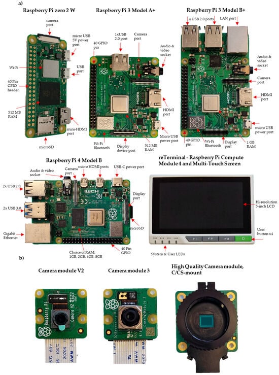 Photographs of (a) Raspberry Pi Boards and (b) Raspberry Pi Camera modules.