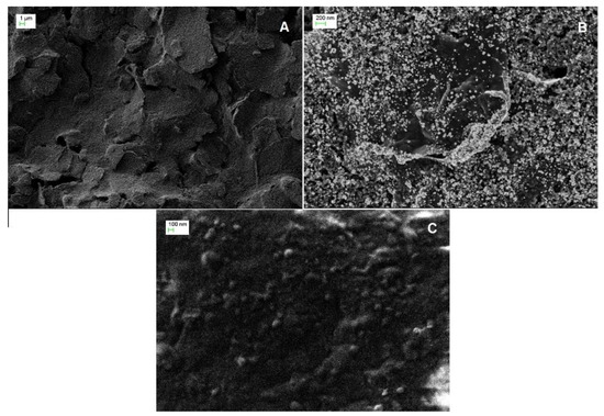 The surface morphology of SPE, AuNPs-ERGO-PAH/SPE, and ADH-sol-gel/AuNPs-ERGO-PAH/SPE electrodes was studied by scanning electron microscopy (SEM). The SEM micrograph of the bare SPE electrode (Figure 1A) shows irregular flakes of graphite, which are randomly oriented. The morphology of the AuNPs-ERGO-PAH composite deposited onto the SPE electrode (Figure 1B) shows the AuNPs included in the composite structure, similar to gelation due to the presence of PAH. A smoother surface was observed after the immobilization of the enzyme with small particles ascribed to the formation of sol-gel in the condensation process in the presence of ADH (Figure 1C).
