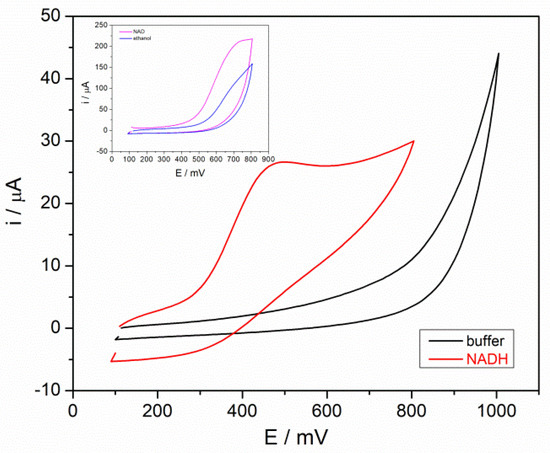 The ADH-based biosensor was tested for detecting NADH, the electrochemical active compound produced in the enzyme reaction catalyzed by ADH, and for detecting ethanol and the oxidized form of the coenzyme (NAD+). Cyclic voltammetry studies were performed with the ADH-sol-gel/AuNPs-ERGO-PAH/SPE biosensor in the presence of buffer, 5 mM NADH, 4 mM NAD+, and 3 mM ethanol, respectively. The voltammograms were recorded over a potential range of +100–+1000 mV at a scan rate of +100 mV/s. As shown in Figure 2, the oxidation peak of NADH was recorded at a potential of +480 mV. No oxidation peak for NAD+ and ethanol was observed at this potential. However, at a working pH of 8.8, both ethanol and NAD+ carry negative charges and tend to accumulate at the electrode surface due to electrostatic interaction with the PAH-based composite. The increase in current beyond +600 mV could be attributed to this accumulation and may indicate the oxidation of ethanol in the latter case. Therefore, ethanol can be determined by its enzyme oxidation in the presence of NAD+, and the electrochemical detection of the NADH produced in this reaction can be correlated with the ethanol concentration.