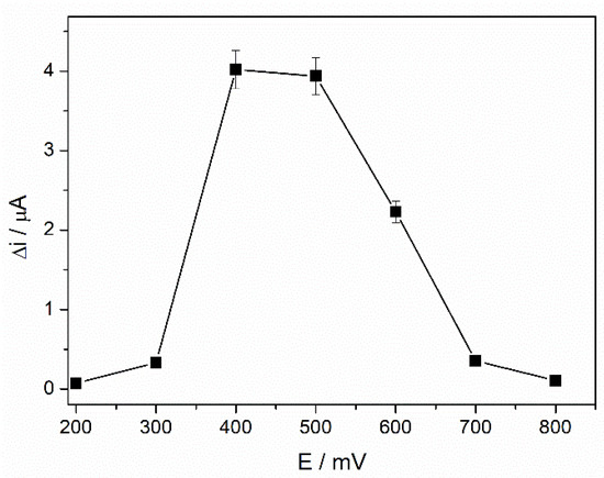 The performances of the amperometric ADH biosensor are affected by the working potential used for detecting the NADH, and optimization of the applied potential can be considered mandatory. Chronoamperometric measurements were performed at different applied potentials in the range +200–+800 mV in 3 mM ethanol and 4 mM NAD+ to achieve this goal. The steady-state signal was recorded before and after each ethanol addition, and the oxidation current variation was determined accordingly. Figure 3 shows how the applied potential affects the electrochemical response of the biosensor. A significant increase in the signal was observed over the potential range between +200 mV and +400 mV, the maximum current being reached at +400 mV. No effective modification was observed at +500 mV, but a significant drop in the current was recorded for higher potentials.