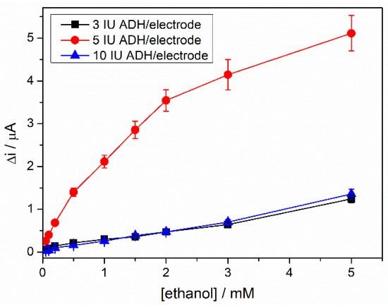 The amount of enzyme immobilized on the electrode surface is critical for the performance of the biosensor. Usually, a higher amount of ADH leads to an increase in the analytical signal. Still, if the enzyme loading is too high, it can block the electrode surface and consequently lead to a decrease in the biosensor response. In this regard, three different ethanol biosensors were prepared where 3, 5, and 10 IU of ADH were deposited on the surface of the electrode. Chronoamperometric measurements were performed with these biosensors at an applied potential of +400 mV, using an NAD+ concentration of 4 mM in 0.1 M PBS, pH = 8.8. Ethanol concentrations were varied between 0.05 and 5 mM. Figure 4 shows the calibration graphs of the three biosensors obtained by the successive addition of ethanol. The biosensor response was significantly enhanced by increasing the amount of enzyme from 3 to 5 IU. A higher amount of enzyme has the opposite effect, leading to a signal drop. Practically, the biosensors with 3 and 10 IU of ADH present almost the same response in the all-ethanol concentration ranges, proving the electrode surface’s blocking effect by the high amount of protein immobilized on it. The highest signal was recorded with the biosensor prepared with 5 IU ADH, which is considered the optimal amount of enzyme for subsequent measurements.
