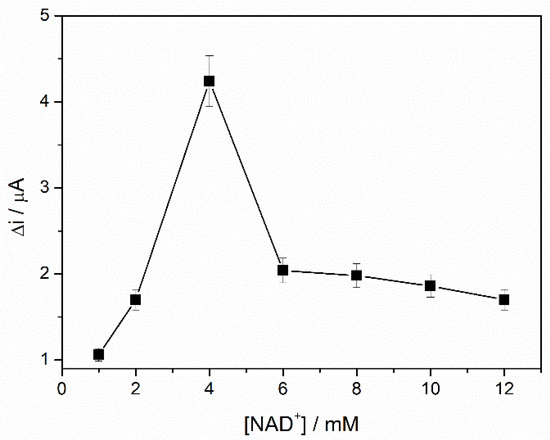 The ADH catalyzes the oxidation of the ethanol and requires the presence of NAD+, which is reduced to NADH that is electrochemically detected. An excess of NAD+ ensures a high reaction rate, consequently leading to a high biosensor response. To study the influence of NAD+ concentration on the ADH-sol-gel/AuNPs-ERGO-PAH/SPE biosensor response, chronoamperometric measurements were performed at an applied potential of +500 mV for an ethanol concentration of 3 mM, while the NAD+ concentration was varied in the range of 1 to 12 mM. The biosensor’s analytical signal, depicted in Figure 5, increases in the concentration range between 1 and 4 mM NAD+, reaching a maximum of 4 mM. A significantly lower amount of NAD+ is required in the case of this biosensor compared to the ADH-sol-gel/PAH/SPE biosensor previously reported [41], for which the optimal concentration was 10 mM. The presence of nanocomposite based on AuNPs and RGO that accelerated the transfer of electrons at the biosensor surface can explain this behavior. A decrease of the oxidation current was observed at higher concentrations of NAD+, probably due to a blocking of the biosensor surface by accumulating an excess of NAD+.