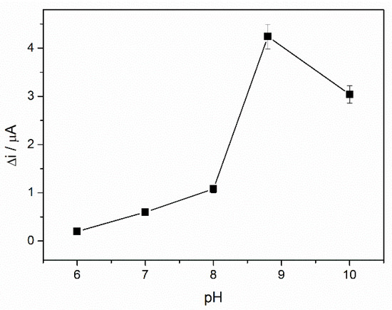 The pH is an important parameter for all enzyme-based biosensors related to the enzyme reaction rate and the electrostatic interaction between substrates and the electrode surface. To optimize the working pH of the ADH-sol-gel/AuNPs-ERGO-PAH/SPE biosensor, chronoamperometric measurements were performed at an applied potential of +400 mV in the presence of 4 mM NAD+ and 3 mM ethanol, varying the buffer pH in the range from 6 to 10. The buffer with pH 10 was prepared by adjusting the pH of the PBS buffer (pH 8.8) with NaOH 0.1 M. As can be seen from Figure 6, the analytical signal increases over the pH range from 6 to 8, reaching a maximum pH value of 8.8. The optimal pH of the ADH reported in the literature is between 8 and 9. Therefore, an optimal pH of 8.8, observed for the biosensor reported in this work, shows that the immobilized enzyme acts as the native enzyme. Moreover, this pH favors the accumulation of NAD+ at the surface of the composite-modified electrode. Consequently, all subsequent studies were performed at pH 8.8.