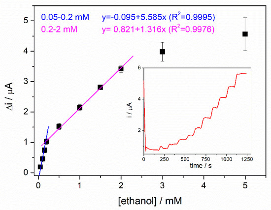 The response curve of the biosensor corresponding to the range of ethanol concentrations between 0.05 and 5 mM is shown in Figure 7, where each point represents the mean value of 3 determinations. Two linear ranges were extracted from this graph. For the first linear range between 0.05 and 0.2 mM, a specific sensitivity of 44.6 ± 0.07 µA/mM·cm2 was determined, and a detection limit of 10 µM was calculated for the signal/noise ratio equal to 3. A second linear range was assigned to the domain between 0.2 and 2 mM ethanol with a lower specific sensitivity of 10.51 ± 0.03 µA/mM·cm2. The enzyme saturation effect was observed at ethanol concentrations higher than 2 mM. The standard deviation of the measurements in this range is almost the same range as the sensitivity of the potential third linear range that could be described from 2 to 5 mM. Thus, it is difficult to distinguish between concentrations that vary by 1 mM, and this range is not helpful for real sample applications. To cover the broad range of ethanol concentrations in alcoholic beverages, it is highly desirable to have a biosensor with a wider working response range that can accommodate all measurements between 0.02 and 2 mM using a simple sample preparation procedure; this will eliminate the need for multiple dilutions of the same sample to fit into a narrow calibration range. With a unique protocol for sample preparation, accurate results can be obtained, as shown in the proof of concept described in Section 3.10.