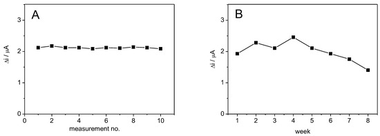 Chronoamperometric measurements were performed to study the operational stability of the ADH-sol-gel/AuNPs-ERGO-PAH/SPE. Figure 8A shows the biosensor response for 10 successive measurements performed every 2 min at an applied potential of +400 mV in 0.1 M PBS buffer containing 4 mM NAD+ and 1 mM ethanol. Between measurements, the biosensor was rinsed with buffer 0.1 M PBS. The relative standard deviation (RSD) of 1.45% was calculated. This value indicates good operational stability of the ethanol biosensor proposed in this paper compared to the ethanol biosensor previously reported by our group [41].
