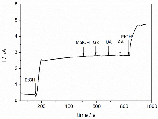 Biosensor response to adding 1 mM ethanol and 1 mM of methanol, glucose, uric acid, and ascorbic acid; E = +400 mV, [NAD+] = 4 mM, PBS 0.1 M pH = 8.8).