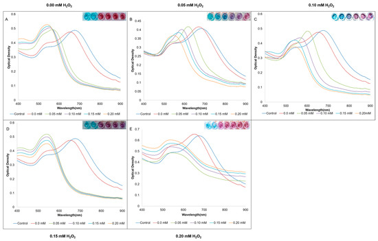 The colorimetric technique was divided into two phases: the generation of redox agents from the apoenzyme–coenzyme complex and the activation of morphological change in the AuNS structure by adding the detection solution [27]. The generation of redox agents on its own is insufficient to induce morphological changes, as shown in Figure 3 and previous studies [41,42,46]. In the presence of neo-formed NADH, the bioassay produced instantaneous monocolorimetric results (Figure 2A). Furthermore, in the H2O2-free assay, the rate of colorimetric signal generation was instantaneous; this phenomenon might be attributed to pH, temperature, or AuNP catalysis for the oxidative recycling of NADH to NAD [32,61,62]. In some instances, the addition of H2O2 to the bioassay resulted in better-localized surface plasmonic resonance (LSPR) band shifts and modest colorimetric signal generation rates (Figure 2B,C) [4,37,63]. As a result, the colorimetric signal generation rates increased as peroxide concentration increased (Figure 1D,E).