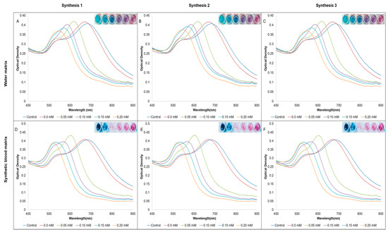 In both water and the synthetic whole-blood matrix, different synthetic batches produced nearly identical colorimetric signals in terms of tonality and slightly variable spectrophotometric readouts (Figure 3).
