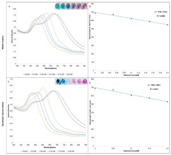 UV-Vis spectra, colorimetric profiles, and mathematical correlation profiles of galactose sensing with AuNS-PVP-GalDH nanosensor: (A,B) water matrix and synthetic blood matrix (C,D).