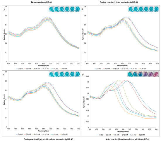 The UV-Vis spectrum changes and colorimetric signals, as well as the accompanying pH fluctuations, are depicted in Figure 5. Even in the presence of varying galactose/NADH and H2O2 concentrations, the bioassays maintained their turquoise blue color with essentially identical spectrum changes as the reaction progressed (Figure 6B,C). The bioassays only produced convincing colorimetric and spectral signals when the detection solution was added (Figure 6D), which is consistent with earlier research [34,48].
