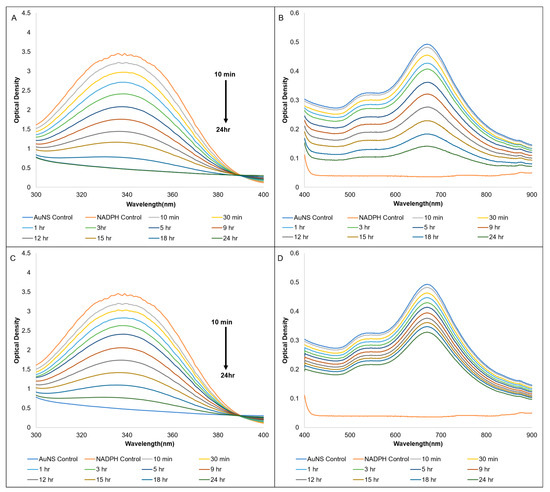 Nonetheless, we employed spectrophotometry to follow the interaction of different NAD(P)H concentrations (Figure 7A ~1 mM; Figure 7C ~0.05 mM) with AuNSs during a 24 h period (Figure 6). Interestingly, the intensity of the 340 nm NAD(P)H absorption band dropped, while the intensity of the 260 nm NADP (+) absorption band increased (Figure 7A,C), verifying Equation (3). The AuNS spectral band, on the other hand, remained constant (Figure 7B,D), hinting that Au0 functions as a catalyst for NAD(P)H-to-NAD(P) oxidation (Equation (3)), a result similar to that found by Huang et al. (2005) [61]. As a result, this evidence reveals that NAD(P)H is transformed to NAD(P)+ on the surface of the AuNS, implying that the AuNS surface-catalyzes NAD(P)H.
