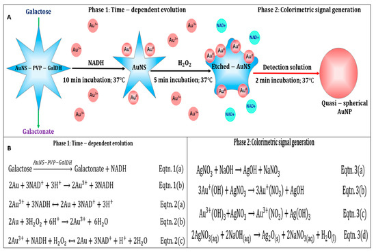 Overall, these findings demonstrate that the signal registered by the AuNS biosensor (transducer) together with the physico-chemical properties of the nanosensor, pH, temperature, detection solution concentration, H2O2 concentration, presence of capping agents, and presence of contaminants may impact the generation of the AuNS biosensor colorimetric signals. As a result, the findings suggest that, with appropriate assay tailoring, the AuNS-PVP-GalDH biosensor can be employed as both a qualitative (Figure 2A) and quantitative (Figure 2B) biosensor.