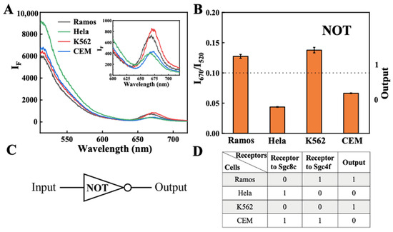 (A) Fluorescence intensity of each cell group with NOT gate logic operation function; (B) values of fluorescence ratio (I670/I520); (C) logic symbols of NOT gate; and (D) truth table corresponding to each cell in NOT gate.