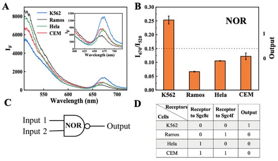 (A) Fluorescence intensity of each cell group with NOR gate logic operation function; (B) values of fluorescence ratio (I670/I520); (C) logic symbols of NOR gate; and (D) truth table corresponding to each cell in NOR gate.