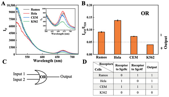 (A) Fluorescence intensity of each cell group with OR gate logic operation function; (B) values of fluorescence ratio (I670/I520); (C) logic symbols of OR gate; and (D) truth table corresponding to each cell in OR gate.