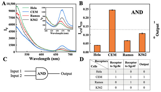 (A) Fluorescence intensity of each cell group with AND gate logic operation function; (B) values of fluorescence ratio (I670/I520); (C) logic symbols of AND gate; and (D) truth table corresponding to each cell in AND gate.
