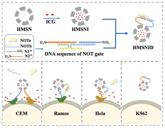 In order to broaden the application of logic gate research, the NOT gate device as an example was further used in vivo. The system design and operational mechanism are shown in Figure 6. In this part of the research content, the DNA sequence of the NOT gate was used as an example to apply the DNA gate device for therapy in vivo. Amino group-modified N1 and N2 were named as N1′′, N2′′. The N1′′ and N2′′ sequences were attached to carboxy-modified HMSNs through a condensation reaction between the amino and carboxyl. After hybridization among N1′′, N2′′, NOTa and NOTb, the DNA complex structure was good at sealing pores in HMSNs (Figure 6). This moment, ICG was prevented from leakage. Receptors on the surface of cells could control the release of ICG by influencing the DNA complex structure. When the receptor bound specifically to the N1′′ or N2′′, the DNA complex structure was destroyed and ICG was released. The ICG could kill cancer cells through its photothermal effect under 808 nm laser irradiation. Specifically, with regard to the CEM cell, it has two receptors that can bind both sequences (N1′′ and N2′′) from the original structure at the same time. So, the door was completely opened and a lot of ICGs were released. For the Hela cell or Ramos cell, they had only one receptor, which could bind to one sequence (N1′′ or N2′′). There were also some double-stranded nucleic acid structures in the orifice. They more or less affected the outflow of ICG. K562 cells do not have receptor and ICG cannot be released. Therefore, the strategy in Figure 6 could achieve different levels of damage to different cells. It was important to note that the cell types damaged were different from those in Figure 1. We just used the sequence of the NOT gates to study the effect on the viability of different cells types.