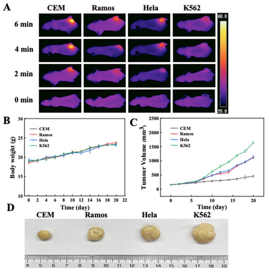 All animal procedures were approved by the Animal Ethics Committee of Linyi University. Healthy female BALB/c nude mice (5 weeks) were purchased from Vital River Co., Ltd., (Beijing, China). Twenty BALB/c nude mice were randomly divided into four groups (n = 5). Five-week-old Balb/Nude mice were used to inoculate CEM, Ramos, Hela, and K562 (4 × 106 cells/animal), respectively. When the volume of the tumor reached ~150 mm3, 100 µL of HMSNID was injected in situ. The mice receiving the same volume of PBS were taken as the control group. During the 21-day period, the body weight of the mice was measured every other day. After 21 days of treatment, the tumors were imaged.