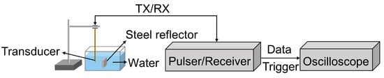 The piezoelectric and acoustic properties of the dual-frequency transducer were characterized. The dielectric property and electrical impedance of the dual-frequency transducer were assessed in air using an impedance analyzer (E4990A, Keysight Technologies, Santa Rosa, CA, USA). The experimental setup for the pulse–echo response is illustrated in Figure 3. The dual-frequency transducer was immersed in degassed water at room temperature. A steel reflector was employed as the target, allowing for the reliable and consistent reflection of the ultrasound waves. Excitation of the dual-frequency transducer was accomplished using a commercial pulser/receiver (DPR 500, JSR Ultrasonics, NY, USA), employing a 6.5 ns pulse width, 170 V pulse amplitude, and 2.5 μJ energy pulse. The echoes were efficiently captured and received by the same device. A digital oscilloscope (DSOX3054G, Keysight Technologies, USA) was utilized to acquire the echo signals.