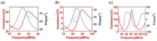 Electronical impedance magnitudes and phase angles of simulated (a) low-frequency transducer and (b) high-frequency transducer, as well as measured (c) proposed dual-frequency transducer.