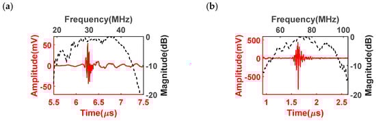 Pulse–echo responses of (a) 30 MHz low-frequency transducer and (b) 80 MHz high-frequency transducer.