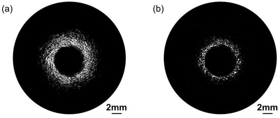 Figure 9 presents ultrasonic images of a blood vessel mimicking phantom behavior obtained using the proposed dual-frequency transducer. A bandpass filter was employed to separate signals from different frequency ranges. To achieve this, we applied the Kaiser window method for filter design. The filter parameters, including the order of the filter, normalized frequency band edges, and side lope suppression control was determined using the Kaiserord function. This approach allowed us to precisely isolate signals within the desired frequency range. The dynamic range is 50 dB. The ultrasonic image in Figure 9a acquired with the low-frequency transducer exemplifies its remarkable deep penetration capability by effectively visualizing the integrated blood vessel phantom. The spiral-like structure shown in Figure 9a was mainly due to the relatively low resolution of the 30 MHz ultrasound transducer for scattering particle imaging in the vessel phantom. Other reasons include the nonuniform distribution of scattering particles in the phantom and small shift in the transducer position during rotation. Figure 9b provides a higher level of detail and spatial resolution, achieved through the use of the high-frequency transducer.