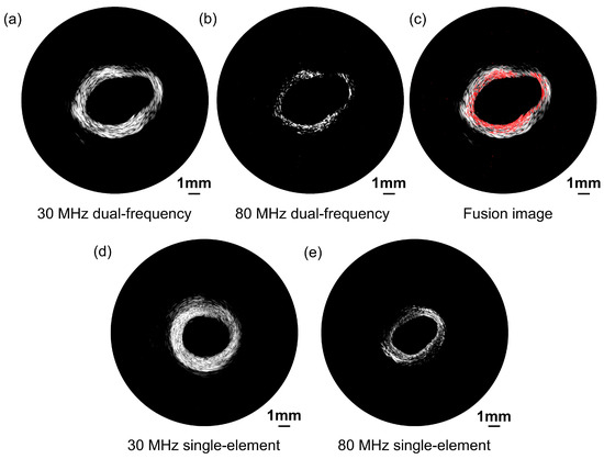 Figure 10d,e present ultrasonic images of a porcine coronary artery obtained using single-element transducers, which serve as the comparison group. Please note that the images shown in Figure 10d,e were obtained from the same porcine vessel but represent a different cross-section compared with the images in Figure 10a,b. This variation is due to the differing positioning of the transducer in the vessel. The 30 MHz single-element transducer’s image reveals the complete blood vessel structure, while the 80 MHz single-element transducer provides a high-resolution image. However, the high-frequency transducer may be susceptible to increased attenuation, resulting in some areas appearing obscure. The imaging results from the comparison group are consistent with those obtained from the proposed dual-frequency transducer. Consequently, the proposed dual-frequency transducer effectively addresses the inherent tradeoff between imaging penetration depth and spatial resolution. The low-frequency transducer excels in penetrating deep into the tissue, enabling the visualization of the entire vessel structure. The high-frequency transducer prioritizes spatial resolution, providing a more detailed representation of the vessel surface. By combining both low and high frequencies, the proposed dual-frequency transducer offers a versatile solution that can adapt to the specific imaging requirements, as illustrated in Figure 10c.