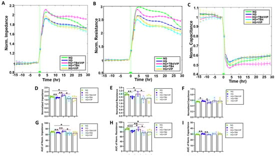 Real-time monitoring of HUCL impedance (measured at an AC frequency of 32 kHz) (A), resistance (measured at an AC frequency of 4000 Hz) (B), and capacitance (measured at an AC frequency of 64 kHz) (C) on a 96W20idf ECIS array. Cells at a 60,000 seeding density were maintained in NG, HG, HG + Tβ4/VIP, HG + Tβ4, and HG + VIP. Impedance, resistance, and capacitance were measured from the time of inoculation (T = 0 h) to 120 h after treatment application. Bar graph representation of normalized impedance (D,G), resistance (E,H), and capacitance (F,I) endpoint values and area under the curve, respectively, for each group. Data shown are mean ± SEM; n = 5/group. * p ≤ 0.05; ** p ≤ 0.01; *** p ≤ 0.001.